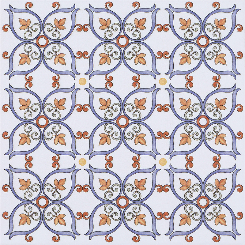 गलीचा रहित सिरेमिक रस्टिक टाइल के पैटर्न के केंद्र में, एक फूल का आकार है जिसे गहरे नीले रंग की रेखाओं द्वारा रेखांकित किया गया है, जिसमें पंखुड़ियों को बाहर की ओर विकिरण किया गया है। केंद्रीय डिजाइन एक सूरजमुखी जैसा दिखता है,जो कि एक ही समय में सजीव और स्तरित हैउसके चारों ओर नारंगी और हरे रंग के पत्ते और अंगूर के पेड़ हैं।