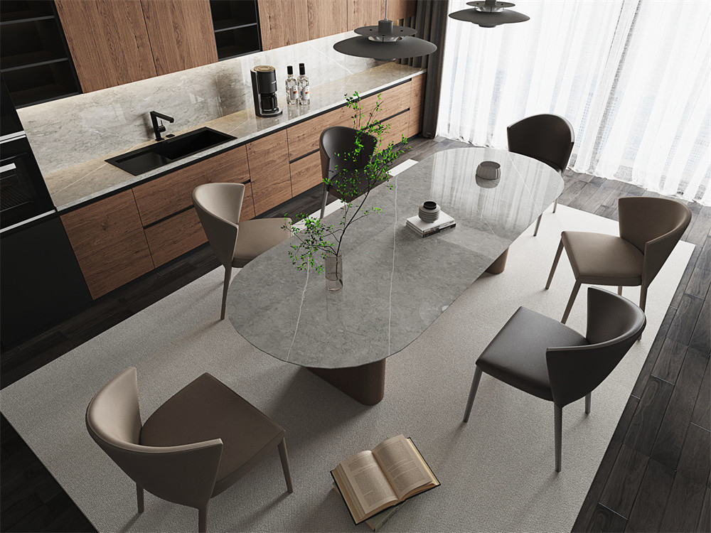 अपने कार्यालय को अपने डेस्क की सतह के रूप में हल्के ग्रे पॉलिश किए गए सिंटर किए गए पत्थर के स्लैब के सुरुचिपूर्ण आकर्षण के साथ बदल दें। यह सामग्री एक आधुनिक खत्म प्रदान करती है जो किसी भी होम ऑफिस को अपनी प्राचीनता के साथ बढ़ाती है,न्यूनतम सौंदर्यशास्त्र.पॉलिश किए गए सिंटर किए हुए पत्थर की चट्टानें एक परावर्तक सतह प्रदान करती हैं जो कमरे को धीरे-धीरे रोशन करती हैं, जिससे काम या अध्ययन के लिए एक आमंत्रित वातावरण बनता है।इसके टिकाऊ और साफ करने में आसान गुण सुनिश्चित करते हैं कि आपका डेस्क समय के साथ बरकरार और कार्यात्मक रहे, दक्षता और शैली दोनों को बढ़ावा देता है।